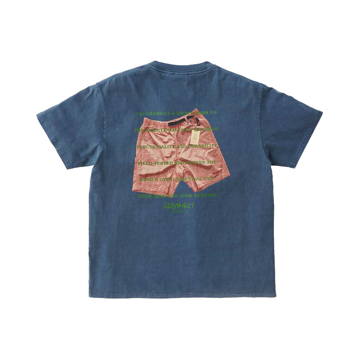 The G-Short Tee is camping attire made from soft, breathable organic cotton. The back of the shirt features a large image of the G-Short, outdoor clothing synonymous with the brand, emblazoned with text in large letters. Available in vintage colors, this classic t-shirt is a stylish, comfortable addition to your outdoor styles.