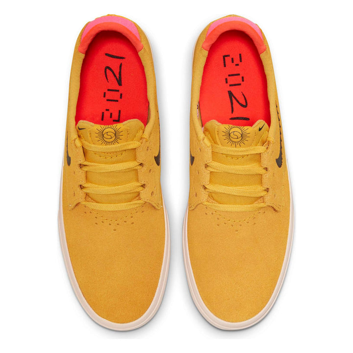 Auf der Einlegesohle, unter der Zunge und auf der Ferse befindet sich ein "Shane"-Print. Das erdige, von der Sonne inspirierte Logo ist ein Mashup aus den Initialen von Shane.